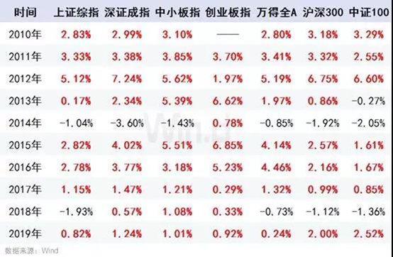 Wind数据统计显示,过去十年,A股同期行情几乎全线飘红。其中创业板指过去9年涨幅概率达100%。