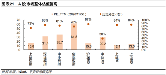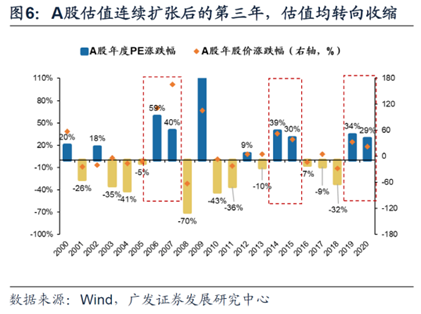 从A股估值的年度变动规律来看,2000年以来A股从未出现过连续3年拔估值,连续2年拔估值仅出现在:06-07、14-15、19-20。06-07年是经济强复苏,14-15是流动性显著宽松,19-20年在疫情发酵下全球宽松亦较为罕见。因此在经历了连续2年拔估值后,21年A股估值大概率转向收缩,2021年A股难以复刻06-07年的盈利强复苏、也很难复刻14-15、19-20年的贴现率猛下行,需要合理降低21年A股收益率预期。
