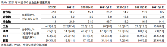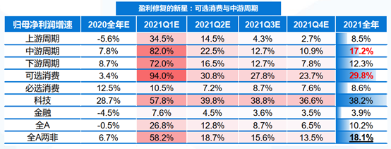 2021年经济增速将前高后低,在2020年疫情低基数的影响下,GDP增速会在 2021年Q1见顶,随后逐季下行。在盈利的节奏和方向上,市场不存在分歧,在盈利修复斜率上可能尚有分歧。