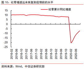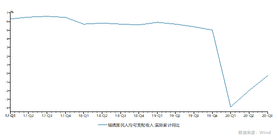 城镇居民可支配收入呈现回升趋势,推升消费意愿。年初疫情影响下,经济活动停滞、失业率上升,居民可支配收入大幅受创,2020年Q1实际累计同比增速降至-3.9%,极大的压制了居民消费。之后随着经济的复苏与全面复工的推进,居民可支配收入明显改善,三季度实际累计同比增速修复至-0.3%,也有恢复空间。