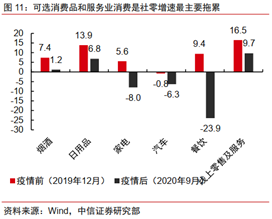 相对必选消费,可选消费板块有望取得更好表现。一方面,消费升级、高质量消费是大趋势。另一方面,疫情影响下,可选消费和服务业消费成为2020年“社零”最主要的拖累,而必选消费反而在某种程度上受益,2021年“社零”增速转正后,可选消费板块将展现出弹性。
