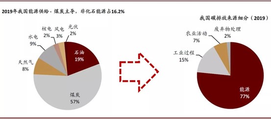 从我国碳排放结构来看,能源是第一大来源,当前供给仍以煤炭为主。
