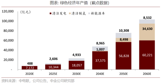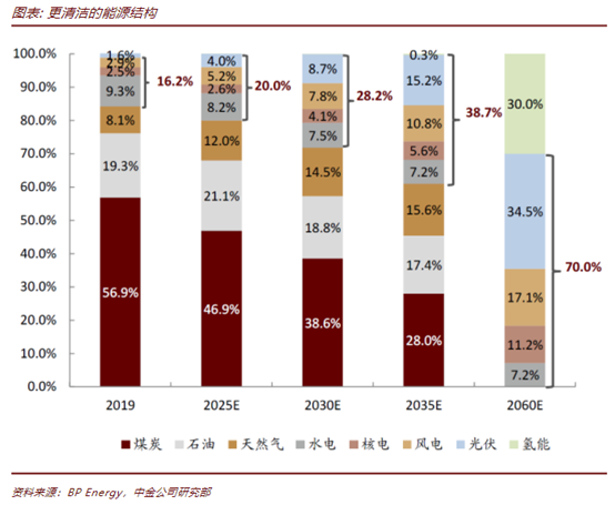 未来,“非化石能源+氢能”将逐步取代传统能源,在不增加碳排放的情况下,支撑能源消费上行。2060年能源消费中,清洁电能将替代石化能源,占比升至70%,剩余30%由氢能满足。