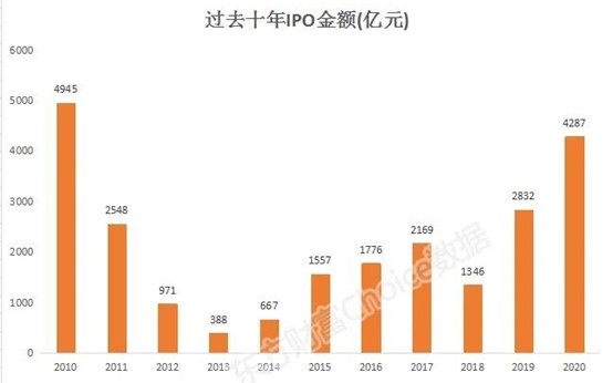 2020年IPO规模约4300亿元,机构乐观预计2021年将达6400亿元,同比增长49%。东方财富Choice数据显示,2020年(截至12月23日)A股上市公司通过IPO合计融资4287亿元,相较2019年全年的2548亿元同比增长68%,同时也创下自2011年以来IPO募资金额的10年新高,仅次于2010年的4945亿元。德勤中国预测,2021年A股新股市场将会进一步扩容,IPO融资规模达到5200-6400亿元。