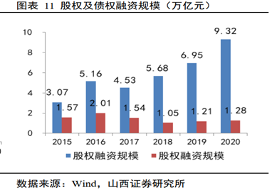 需求端:(1)IPO:监管层频频发声定调,21年全面注册制落地实施,主板首发规模预计大幅上升;CDR加速推出,海外新经济回归渠道扩展,创业板资金需求加大。在股市扩容及IPO常态化的确定性趋势下,预计明年存量A股及科创板IPO分别3500亿/2000亿元。(2)定增:政策红利逐渐衰退,一是战投边际收紧,入场标准趋严;二是折价空间收窄,新规以来竞价项目平均折价率15.07%,未来随着更多投资者涌入定增市场,优惠力度减弱。明年定增市场或将有所收缩,预计规模6000亿元。