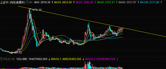 下图为上证日线和上证50月线图,上方的压力位是下周观察的重点,如果量能不能再放大,之后很有可能将会迎来短期震荡调整。