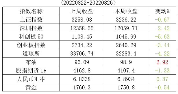 本周大盘震荡下行,上证综指下跌0.67%,深证成指下跌2.42%,创业板指下跌3.44%,科创50指数下跌5.63%,沪深300指数下跌1.05%。近一段时间新能源赛道调整,一些近期强势股跌幅较大。与此同时,传统能源、金融股、消费板块撑起了大盘,稳定了投资者的市场情绪。市场已经开启切换,赛道内从高估值切向低估值,行业间从热门切向冷门,板块轮动使得结构性行情持续。下周将迎来8月行情的收官之战,8月剩余的3个交易日里,A股共有1592家上市公司披露中报,已经披露中报的公司超过2700家,可见下周披露中报多么密集,喜忧参半。周末消息中美签署审计监管合作协议,算是超市场预期的一件事情,恒生科技指数以及美股上市的中概股本周后两天都大幅反弹,应该是对于此项合作协议的提前反应。美联储鲍威尔的讲话显示,未来几个月,美联储可能仍会大幅加息,应该是预期之内,通胀不降加息不止。当前市场处于混沌状态,新主线低估蓝筹的补涨机会,和老主线光伏、新能源车的修复行情,会有一个来回切换的过程,最终确认新的主攻方向。操作上,预计短期震荡分化还将维持一段时间,在9月9日之前市场还将维持震荡反复的走势,中秋节之后市场才可能结束盘整走势,是否选择向上突破,拭目以待。重点关注消费、金融、旅游酒店及风电、氢能板块。