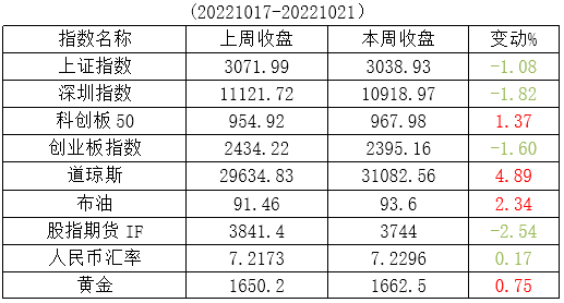 本周沪指下跌1.08%。沪深300跌2.59%,创指跌1.6%,科创50涨1.37%。成交量上,除科创50成交量有较大增长24.44%,其余板块变动不大。盘面显示,以高新技术公司为主的科创板本周较为活跃。周末也是利好不断,美联储加息的预期有所减弱;日元出现阻击;美俄之间展开对话;券商转融通、两融组合拳释放利好;叠加之前房企融资放开、政府房屋回购、上市公司股份回购、基金自购等消息,应该能对市场产生一定的效应。随着三季报的陆续推出,业绩有良好增长预期的上市公司将获得更多的市场青睐,一些景气行业的低估值股票值得关注。从长周期看,A股基本跌到了磨底位置,这已是市场共识。几乎所有的券商报告都会告诉你,市场已经进入了较高性价比区间。也许当下能做的,就是在黎明前的黑暗不离场。医疗,半导体,证券极大概率是后续行情的主力。