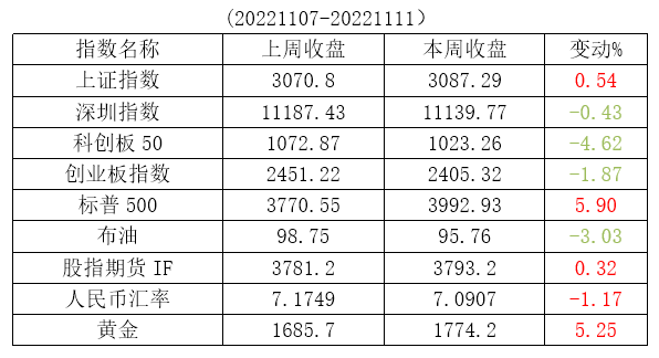 本周A股先抑后扬,上证周涨幅0.54%。深证成指周涨幅-0.43%。上证50周涨幅2.02%。沪深300周涨幅0.56%。创业板周涨幅-1.87%,科创50周涨幅-4.62%。因为历史原因A股天然就对政策敏感,防疫、美联储、房地产融资、人民币汇率等多重利好叠加,市场预期出现了改变。防疫政策的此次调整是防疫政策边际优化,遏制传播同时尽可能降低对经济影响,防控的总方针依然是“动态清零”,总策略依然是“外防输入、内防反弹”。美国10月CPI数据同比上涨+7.7%,低于9月的+8.2%。美国通胀,它是一个“去全球化”的报复,美国看似誓与通胀搏斗,这是一张明牌,背后目的是重塑美元信用。G20会议即将召开,外部环境也有回暖的预期,下周大领导将出席印尼G20峰会,并明确会和法国、美国等进行会见。俄乌战争的变化也许出现在美中期大选之后。10月新增社融9,079亿元,同比少增7,097亿元,低于市场预期。10月实体信贷新增4.431亿元,同比少增3,321亿元,为近十年同期最低。10月居民贷款继续低增少增,企业短贷负增,企业长贷高增,中国10月社融数据呈现躺平、摆烂特征。目前股市基本面并未有明显好转,市场上涨更多是情绪上的修复,是对前期不理性下跌的修正。中央经济工作会议也将于下月中旬召开,今年工作会议是本届第一次关于经济发展的大会,重要性不言而喻,是稳增长政策重要窗口。总而言之,情绪是上头的,切不可头脑发热。未来基建很可能出现退坡,房地产只是政策维持,短期关注困境反转板块旅游、航空、酒店、餐饮。建议远离疫情检测相关板块。关注沪深300和上证50和证券保险板块。中长期关注消费、医药、科技板块的机会。